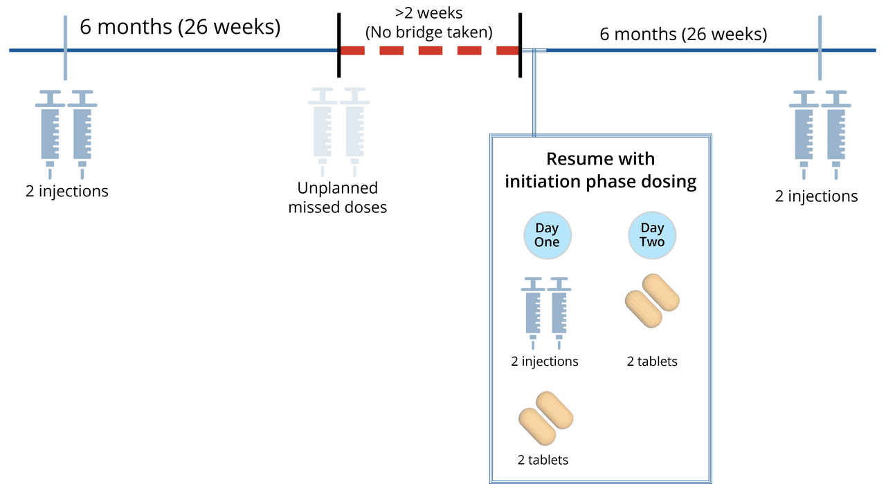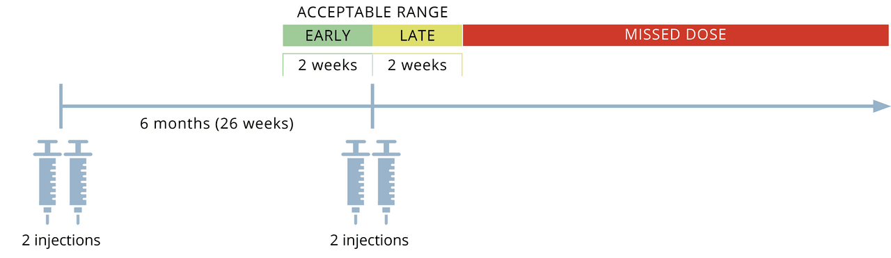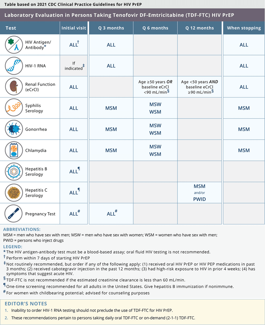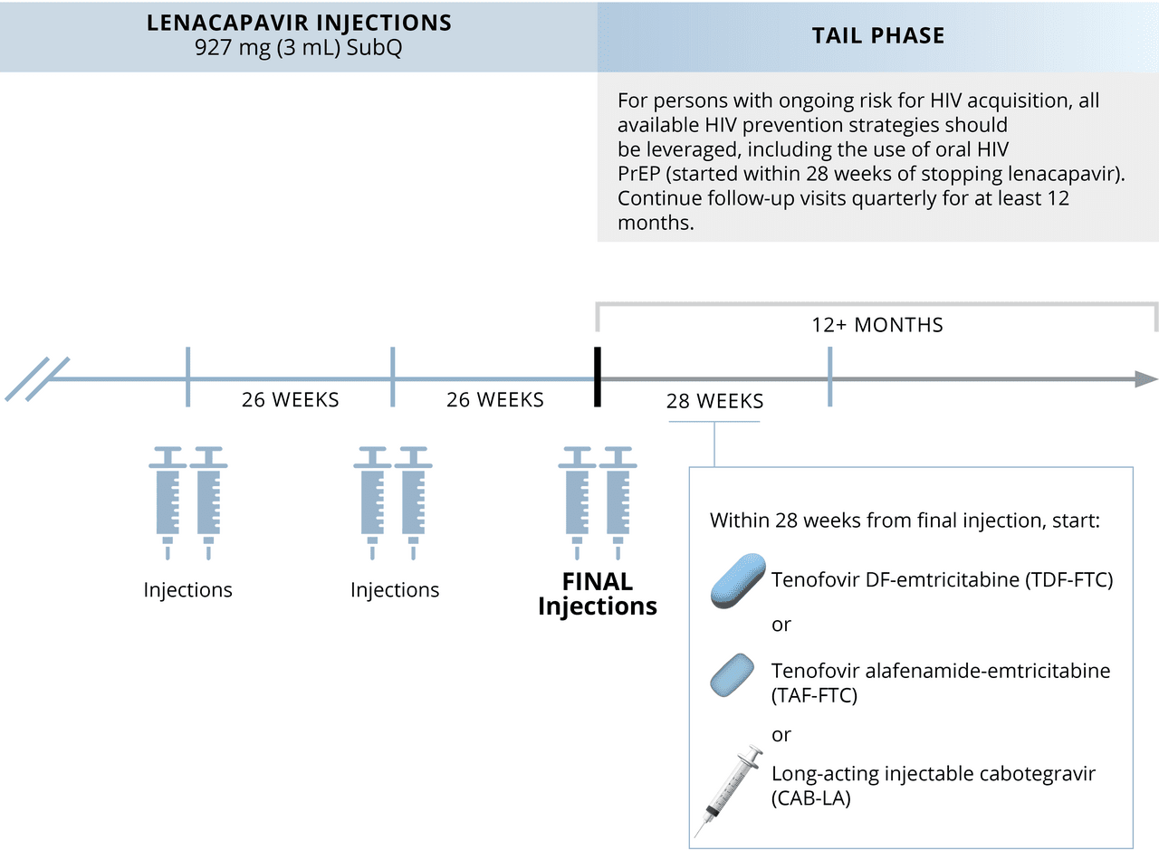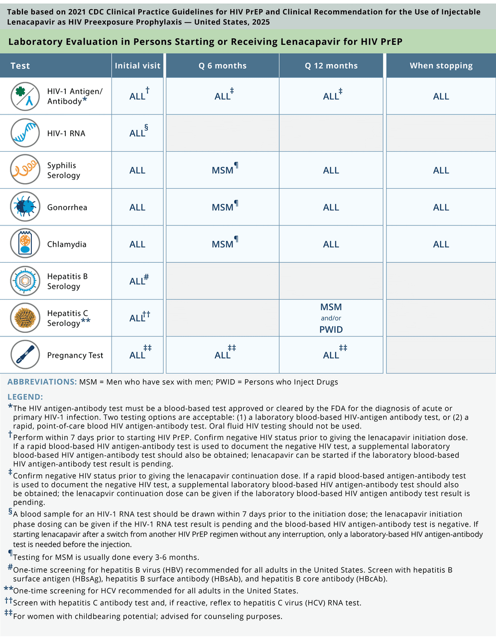 Different models exist for the type of follow-up visits. For the models used below, some clinics use a hybrid model, such as clinic visits alternating with virtual visits, with an option to allow the person receiving HIV PrEP to drop in for laboratory and self-testing at their convenience. For persons receiving oral HIV PrEP with tenofovir DF-emtricitabine (TDF-FTC) or tenofovir alafenamide-emtricitabine (TAF-FTC), there may be options for virtual visits and off-site (or home) laboratory testing. Since persons receiving long-acting injectable cabotegravir (CAB-LA) are seen in the clinic every 2 months for cabotegravir injections, there is no real need or benefit for routine virtual visits or non-clinic-based laboratory testing. For persons receiving lenacapavir subcutaneous injections (LEN-SQ), on-site visits are required every 6 months for LEN-SQ injections in the clinic. Additional interactions are advised to follow-up for laboratory testing and review of possible adverse effects; for additional interactions that do not require in clinic visits, off-site options can be used.[1]